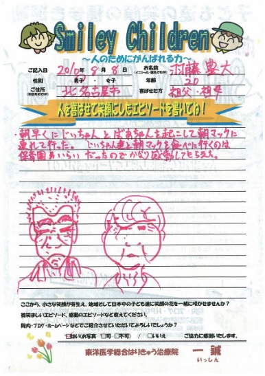 TOP > 取組み・活動のご紹介 > 子ども達の笑顔の種まき運動(スマイリーチルドレン) > 羽藤 豊大 様 2021年2月20日 2010.08.08 氏名 羽藤 豊大 様 性別 男子 年齢 20歳 ご住所 北名古屋市 喜ばせた方 祖父・祖母 (ご本人様より掲載許可をいただいております) クリックで拡大表示 ご来院時のお願い ■予約優先制となっておりますので、事前にご予約をお願いします。 ■初診時には問診用紙を記入していただくため、10分前にお越しください。 ■再来患者様は、ご予約の5分前にお越しください。 ■食事や入浴、運動は治療前後30分以上空けてください。 ■楽な服装でお越しください。当院では、お着替えをご用意しておりますが、お持ちいただく場合は、ももまで上げられるパンツと半袖のTシャツをご用意ください。 ■キャンセルされる場合はご連絡をお願いします。 病院・医院に通院されている方へ 現在、病院・医院などで治療を受けられている方も、一鍼の治療との併行治療をおすすめいたします。 一鍼の治療は、体の負担が少なく自身の持つ治癒能力を高めていく東洋医学的治療です。 病院・医院での治療に良くない影響を与えるものではありませんので、安心してご来院ください。 なお、病院・医院のご紹介状をお持ちの方は、受付にご提出ください。 西洋医学に加えて体に優しい東洋医学を上手に取り入れて、健康管理のために役立ててみてはいかがでしょうか。 ネット予約はこちらから 診療予約 ご予約優先052-761-9780 Twitter Share Pocket Hatena LINE コピーする -子ども達の笑顔の種まき運動(スマイリーチルドレン)