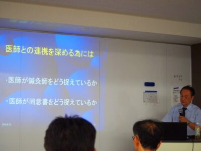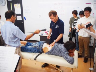 (公社)日本鍼灸師会専門領域研修制度「スポーツ傷害」第8回講習会の運営並びに参加をいたしました。コモリタ治療院 院長 小森田 明浩先生「腰痛のスポーツ傷害(講義)」(第1部)、「腰痛のテーピングと鍼治療(実技)」(第2部)、鍼専門治療院杏林堂 院長 土屋 二郎先生「頸部障害に対する経絡治療」(第3部)、(一社)愛知県鍼灸師会 会長 長谷川 栄一先生・保険部長 廣畑 守先生「保険取扱い研修会~同意書を書いてもらうには~」(第4部)をご講演いただきました。第1部では、「腰痛の原因・種類、注意を要するもの、主な鑑別テスト、施療のおおまかな流れ、筋・筋膜性の腰痛の施療例、ストレッチ、筋トレ、腰部のテーピング」についてご講演いただきました。第2部では、ご講演の内容をもとに実演をしていただきました。そして、参加者でペアになり、腰部のファンクショナルテーピングを巻く練習を行いました。第3部では、「治療の実際、記録方法、施術、小川点」についてご講演いただき、頸部障害に対する問診、脈診、治療に至るまで実演していただきました。そして、肘部の小川点への鍼治療にて頸部の痛みならびに可動域制限の改善の実演をしていただきました。第4部では、医師連携を行うために「紹介状、同意依頼状、治療計画書、同意礼状、治療報告書」の記載事項の紹介がされました。また、「保険取扱いについての最近の傾向、返戻事項、注意点等」についてご講演いただきました。今後も、医師との信頼関係を築いていくために必要であると思われます。ご参加いただきました先生方におかれましては、明日からの臨床に活かしていただければ幸いと存じます