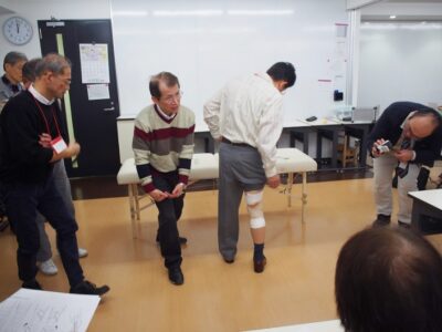 (公社)日本鍼灸師会専門領域研修制度「スポーツ傷害」第9回講習会の運営並びに参加をいたしました。コモリタ治療院 院長 小森田 明浩先生「膝のスポーツ傷害(講義)」(第1部)、「膝関節のテーピングと鍼治療(実技)」(第2部)、(一社)愛知県鍼灸師会相談役・セントラルたなか鍼灸院 院長 田中 法一先生「癌に対する戦い~直腸癌の経験を通して~」(第3部)、(一社)愛知県鍼灸師会 会員 岡元 隆一先生「徒手検査について~日鍼会臨床研修参加報告~」(第4部)をご講演いただきました。第1部では、「膝の傷害・種類、傷害箇所のテスト法、傷害の圧痛部位、ケガへの施療と復帰(問診・応急処置・鍼の施療・ストレッチ、トレーニング、テーピング)、内側側副靱帯損傷の治療例、前十字靱帯のテーピング」についてご講演いただきました。第2部では、ご講演の内容をもとに実演をしていただきました。そして、参加者でペアになり、内側側副靱帯損傷ならびに前十字靱帯のファンクショナルテーピングを、どの部位をどの方向に制限をかければ良いのかというポイントを踏まえながら巻く練習を行いました。第3部では、「「ガン」に勝つ精神、気「生命の源」・宇宙エネルギー、陰の気・陽の気、病気の気と元気の気、治療目的と方法」についてご講演いただき、ご自身の経験に基づいて鍼灸治療の素晴らしい可能性をお話していただきました。「病になっても病気にするな」という病に打ち勝つ精神について大変貴重なご内容でありました。第4部では、「腰痛・坐骨神経痛の問診、徒手検査」についてご講演ならびに実演をしていただきました。これからも鍼灸師は、専門性を持つことが必要とされています。ご参加いただきました先生方におかれましては、スポーツ選手および疾患をかかえていらっしゃる患者様への臨床に活かしていただければ幸いと存じます。